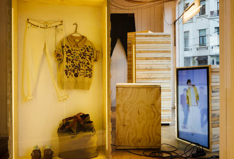 For this special occasion, frank agterberg/bca created a window installation that is capable of making a swift transition from past to present. The first three weeks of the campaign are riding on a wave of nostalgia and pride. Vintage garments, ditto still imagery and animated footage are on display in multipurpose expo cabinets. Made of plywood and their sides covered with uneven wood-strips, these boxes create a look that perfectly matches the brands’ identities. Distinctly perceived from the street, of course, but with instore visibility as well.
