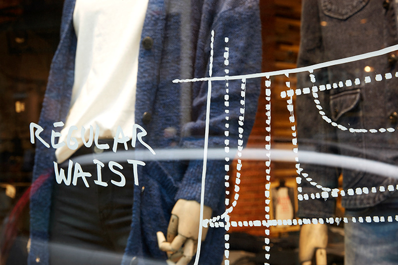 When it comes to tailoring, both fits push the envelope, so we drew their silhouettes on the store windows by hand to emphasise the authentic craftsmanship behind them. Apart from these explanatory window decals we added mannequins wearing the new fits and completed the window’s composition with framed imagery of Malone and Skyler.