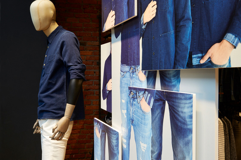 To showcase Luke and Arvin, Lee®’s snug-fitting cuts, we dressed up the mannequins in them and suspended exploded collection imagery in the background. The positioning of these images creates a three-dimensional effect, adding to the window’s tight composition without stealing any of the Tapered’s attention. We cut the extras, kicked the bells and whistles to the curb and created a less-is-more way of welcoming Luke and Arvin to the family.