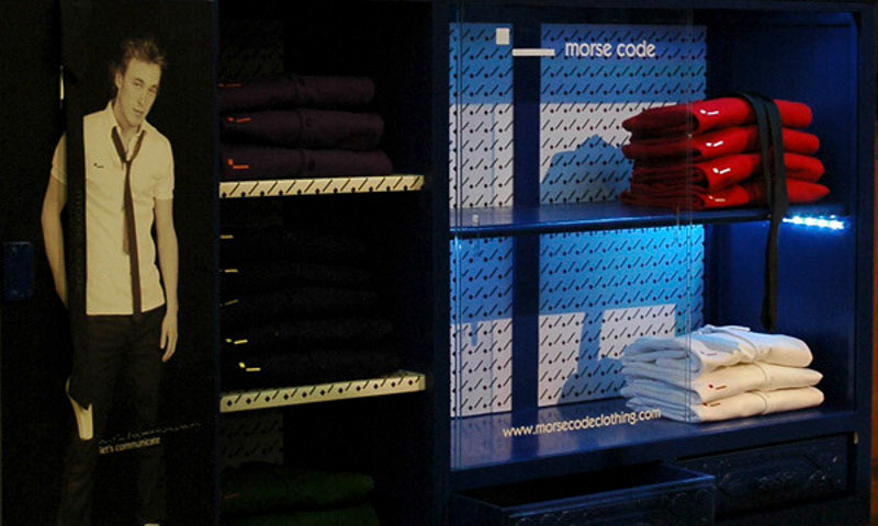 Easier said then done, we searched for the right fixtures from ‘the days of yore’ that met the technical requirements for displaying the product. After selection (and cleaning) we transformed them into contemporary pieces of art. Each fixture was painted in a single color and was unique in form and function. Interior and shelves were covered with morse code® pattern prints. Morse code® branding was applied on key areas. The drawers and cabinets can be used for additional stock of polo shirts or the morse code® silk tie… to wear it right!