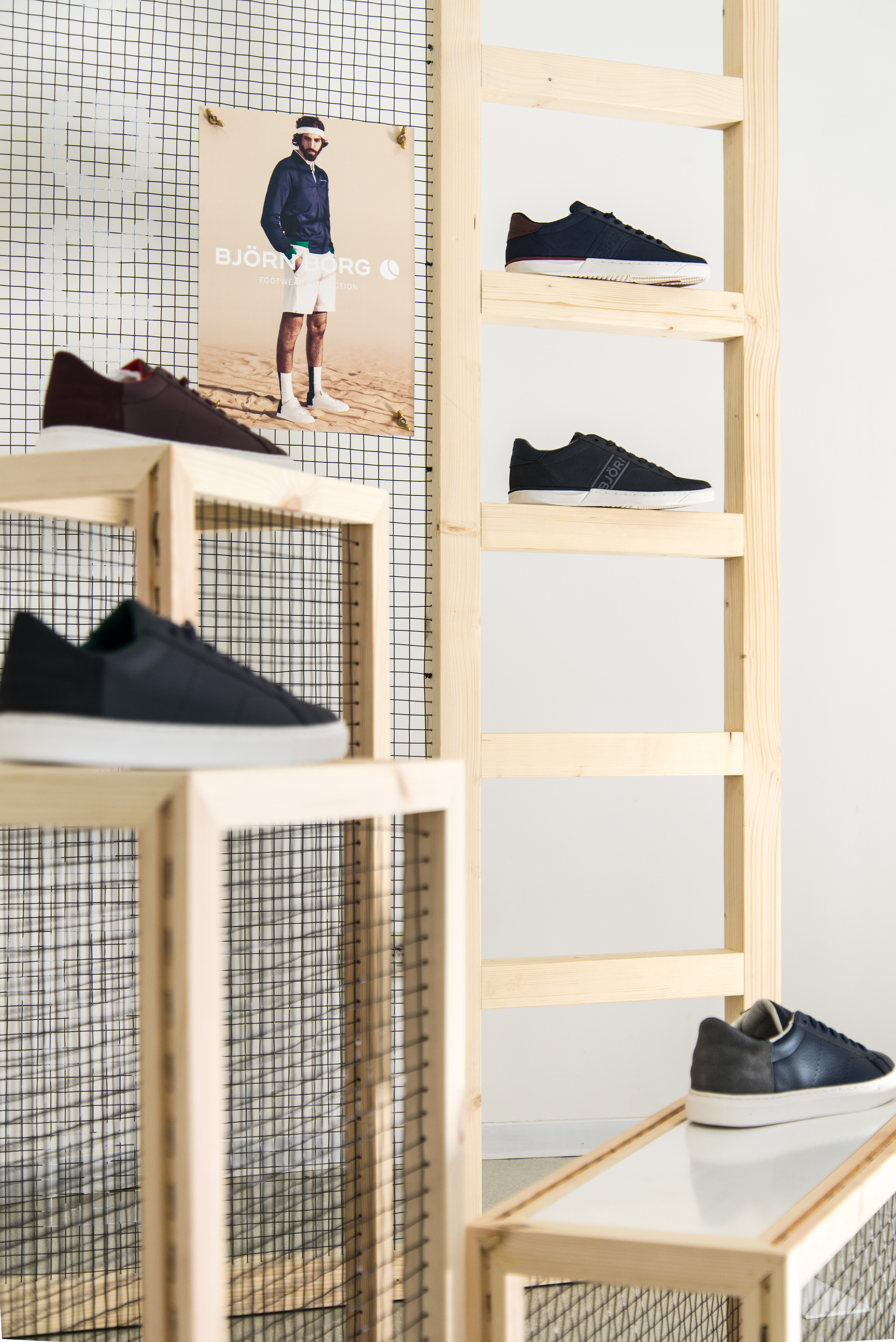 Way before being the brand name on many underwear waistbands and sporty footwear, Bjorn Borg was a world number 1 tennis player who skyrocketed tennis’ popularity during the 1970s. Inspired by this Swedish sports icon’s history we started building a footwear display for the brand’s pop-up stores and added features from authentic wooden tennis rackets used by Borg back in the day.